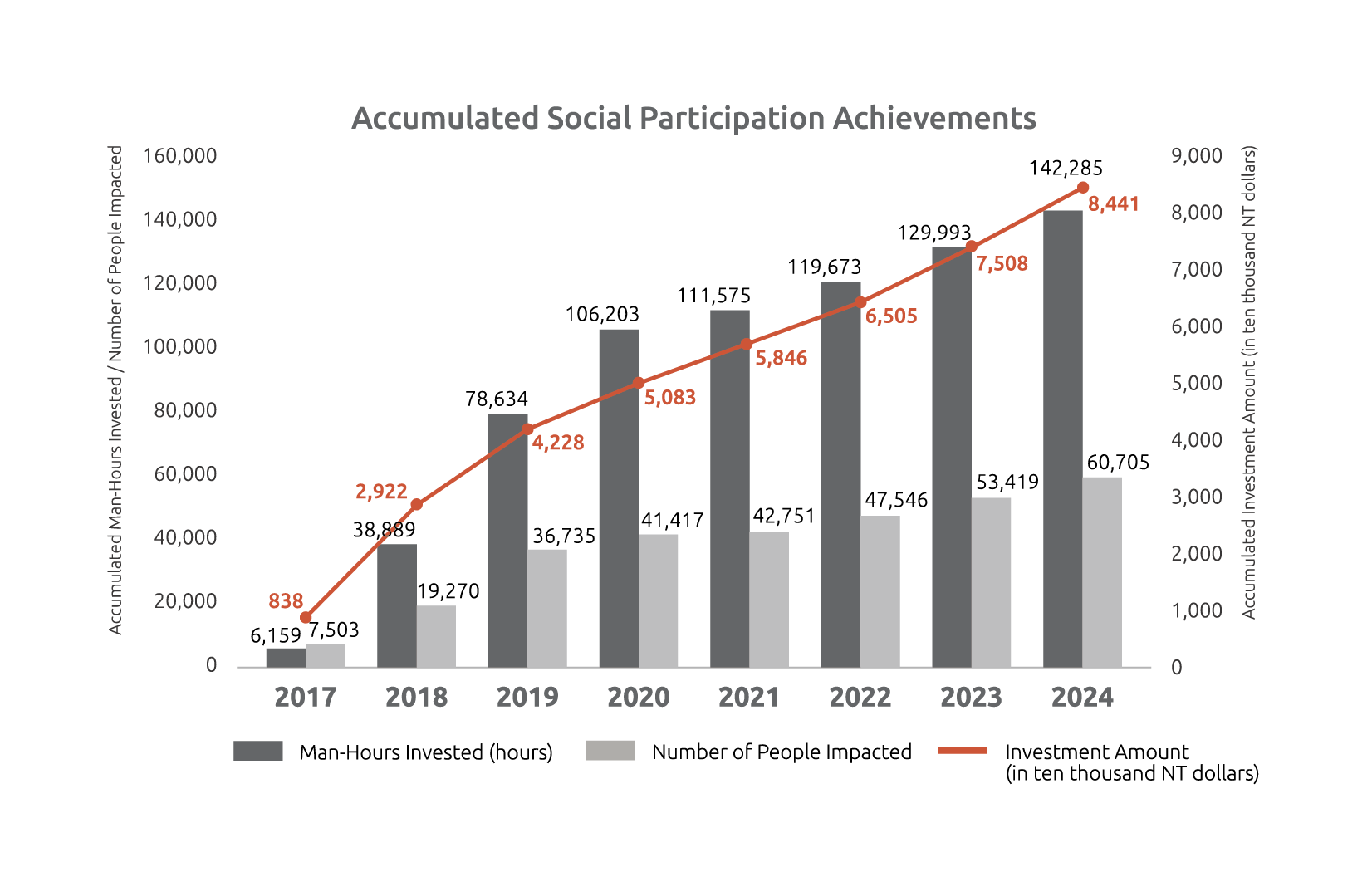 Since 2017, the Group’s cumulative investment in social initiatives has exceeded NT$84.41 million with over 140,000 hours of manpower contributed. During this period, the Group has hosted nearly 2,000 events and engaging more than 60,000 stakeholders, generating a positive social impact. In 2024, the Group has invested over NT$9.33 million and 12,292 hours of manpower, organizing a total of 436 events through both formal and informal channels, reaching approximately 7,286 stakeholders across various levels.