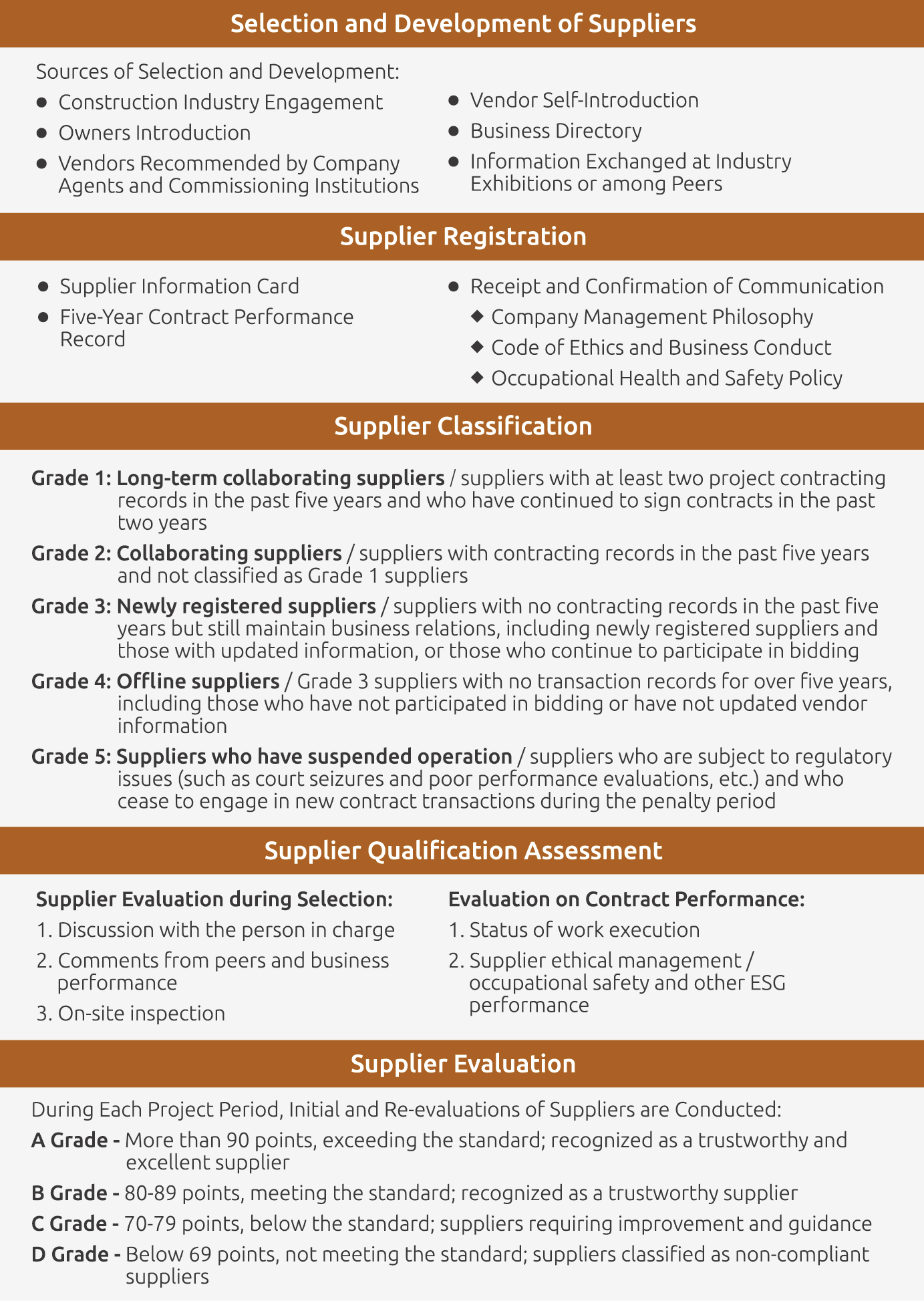 All of CHC Group’s suppliers sign the Declaration of Compliance & Questionnaire and assist with the assessment of the compliance with business ethics and determination of conflict of interest. The business ethics clause has been added to subcontracting and procurement contracts, which include anti-corruption, avoidance of conflict of interest, and rules for ethical management. Meanwhile, the procurement standards were amended to include the commitment to ethical management as a requirement for supplier evaluation and management, and to provide suppliers with consultation channels in order to help them understand the Group’s guidelines for business ethics. On the other hand, sustainability performance indicators, such as human rights, employee care, occupational safety measures, waste management, energy-saving measures, and integrity, are used for evaluating and managing suppliers' performance. Outstanding suppliers can earn additional points in the evaluation and increase their chances of winning bids, thereby promoting sustainability management throughout the supply chain.