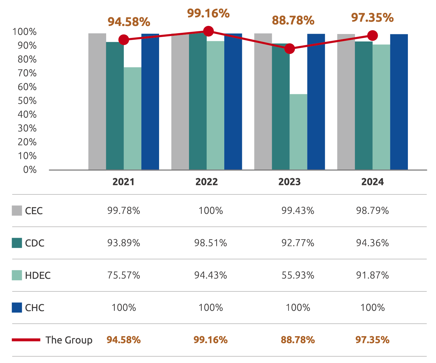 Supporting local procurement is a way of fulfilling corporate social responsibility. Except for the Environmental Project Development Business, where water treatment equipment is primarily supplied by foreign manufacturers and thus must be purchased from abroad, the rest of the Group members practice local procurement. In 2024, the local procurement ratio of the CHC Group was 97.35%, an increase of nearly 9% compared to that in 2023. The local procurement ratios for CEC, CDC, and HDEC were 98.79%, 94.36%, and 91.87%, respectively.