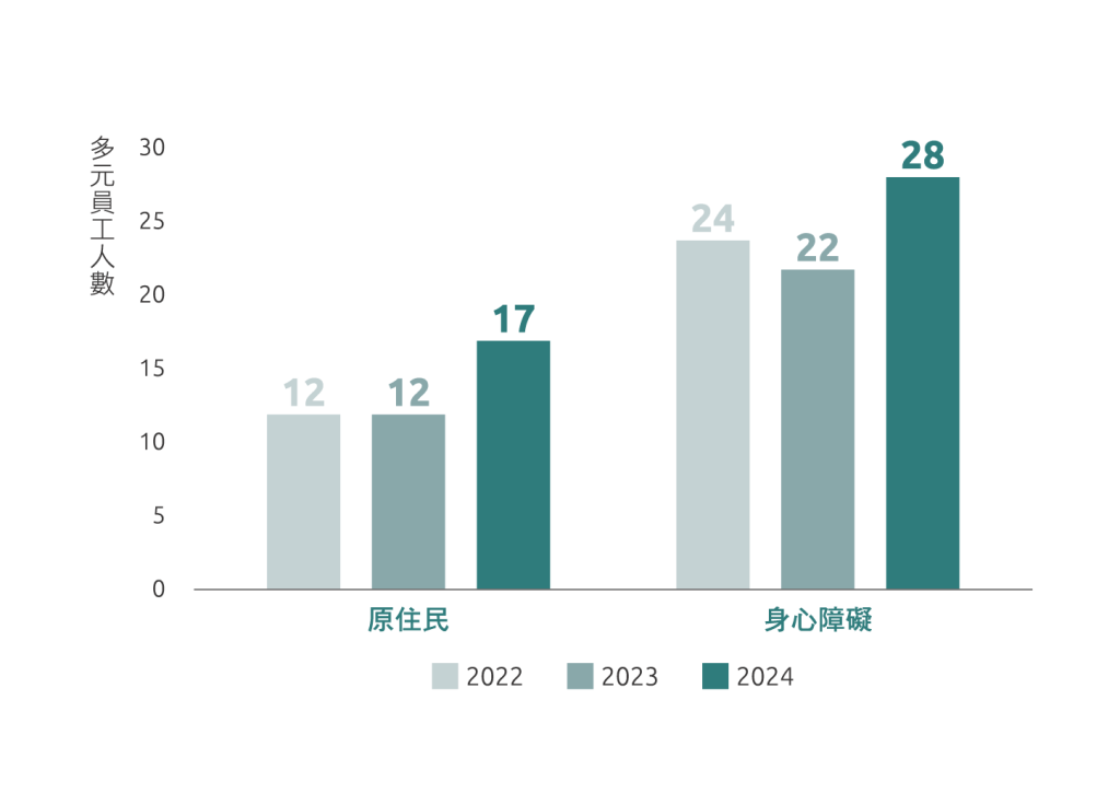 集團持續落實身心障礙員工進用,並重視員工的多元性,2024年集團內女性員工533人,較2023年的493人增長8.1%;原住民員工17人較前一年度成長42%,並尊重不同的文化習俗,在集團內部無任何違反工作權及人權事件發生。