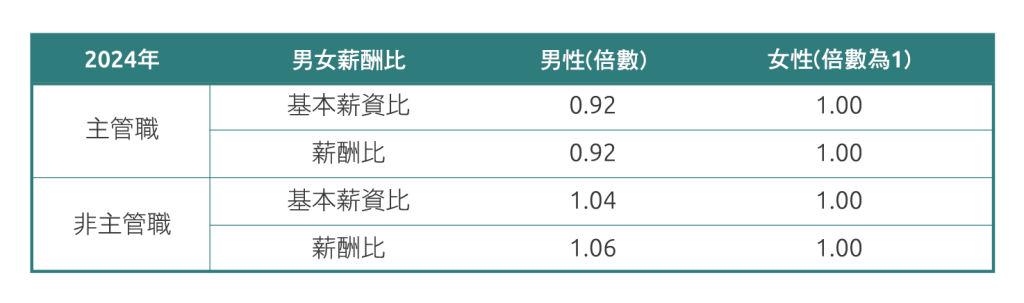 在性別與薪資關係上,2024年度統計男性基本薪資比,以女性為基準,男性主管職約0.92倍,男性非主管職約1.04倍;薪資比分別為0.92倍及1.06倍。在主管職或非主管職之女男薪酬近乎相當。公司之薪酬政策會持續朝向性別薪資無差異化方向推行。