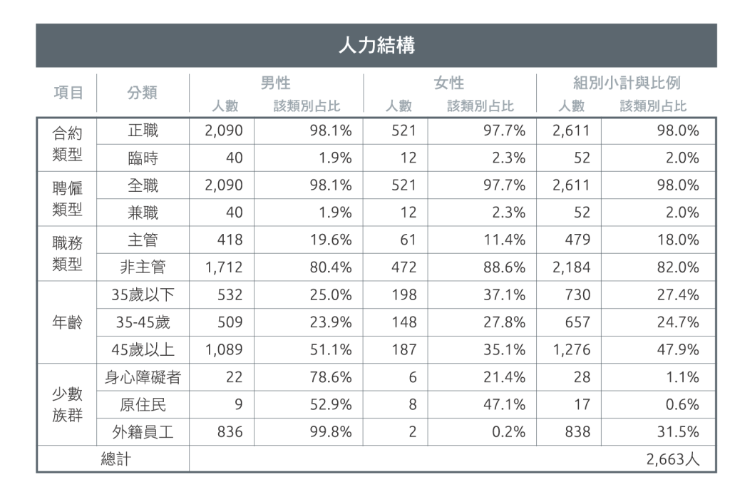1. 統計不含董事長、工讀生、移工與直接施作人員。