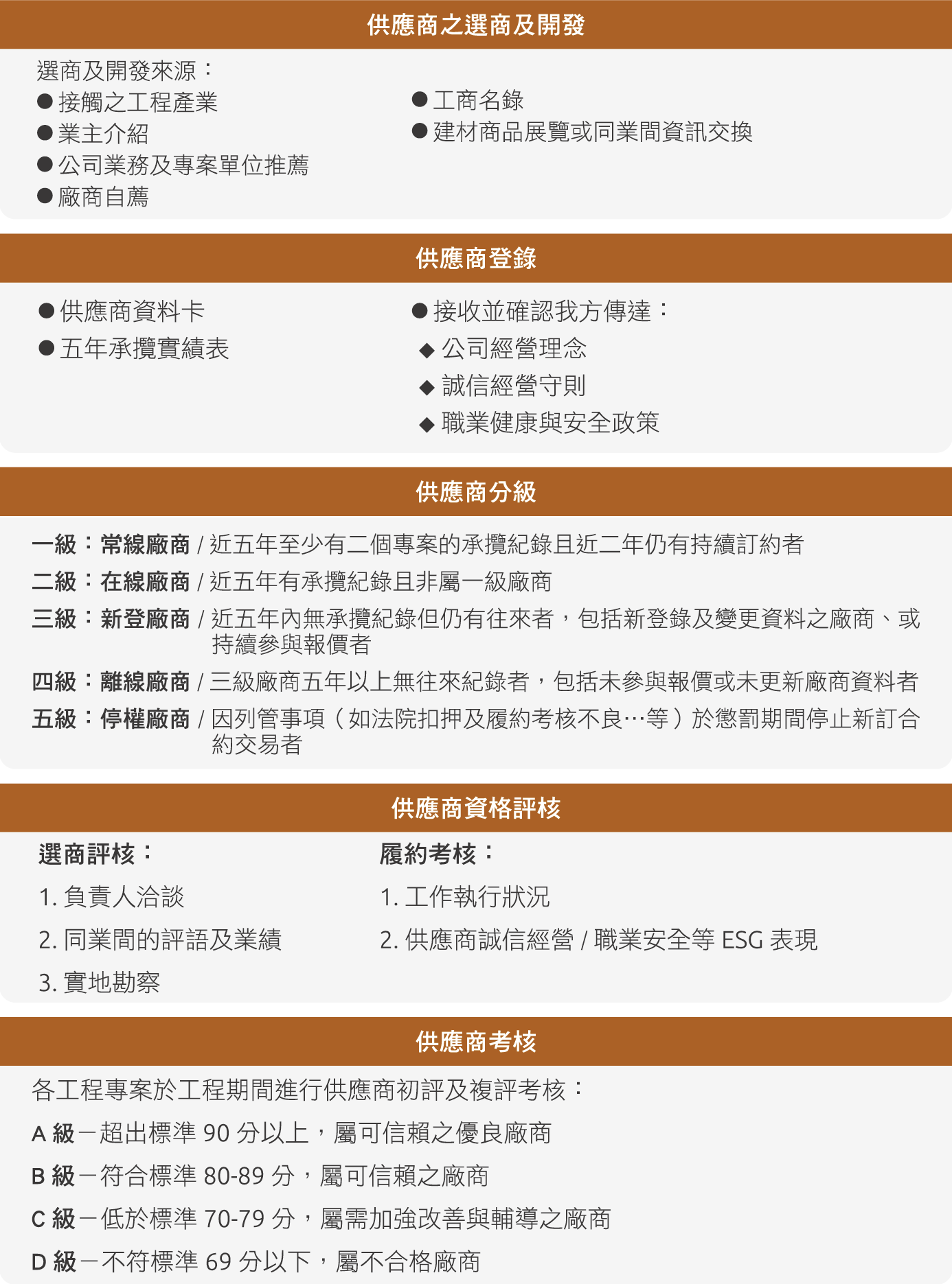 欣陸集團往來之供應商均簽署誠信經營聲明書,並配合辦理供應商之誠信經營遵循及利益衝突之調查。集團已啟用誠信經營合約條款,包含反貪腐、利益衝突迴避、是否訂定誠信經營之規章等條文,同時修訂採購規範,將誠信經營承諾列為供應商評估考核與管理的必要項目,亦提供供應商諮詢管道以協助其理解集團誠信經營要點。 另一方面,集團將供應商永續表現,如人權、員工照顧、職業安全措施、廢棄物管理、節能措施、誠信經營等項目,列為供應商管理及優良供應商評選機制的評選項目,表現優良的供應商可以獲得選商評分額外加分、提高得標率,以帶動供應鏈提升永續管理水準。