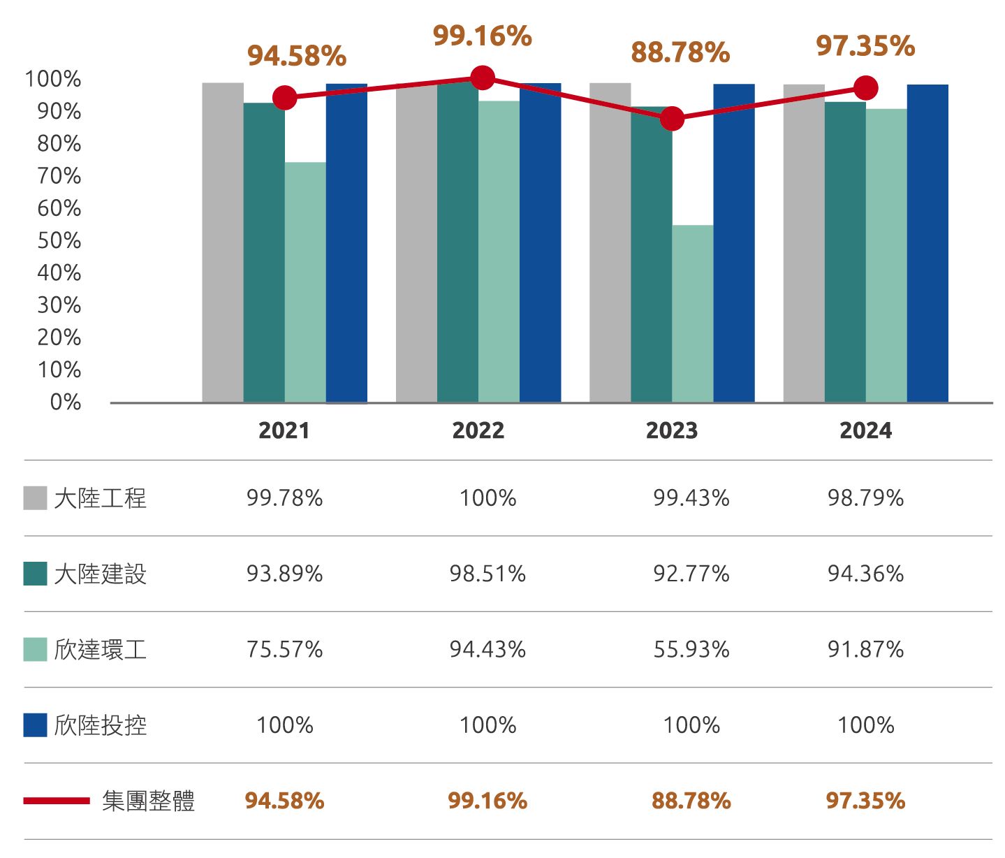 支持本地採購為實踐企業社會責任作為之一,本集團除環工事業因水處理機器設備多掌握於外國廠商手中,須以國外採購為主外,其餘成員公司的採購皆以本地採購為原則。2024年度欣陸集團在地採購比例為97.35%,較2023年增加近9個百分點;大陸工程、大陸建設以及欣達環工的在地採購比例分別為98.79%、94.36%以及 91.87%。